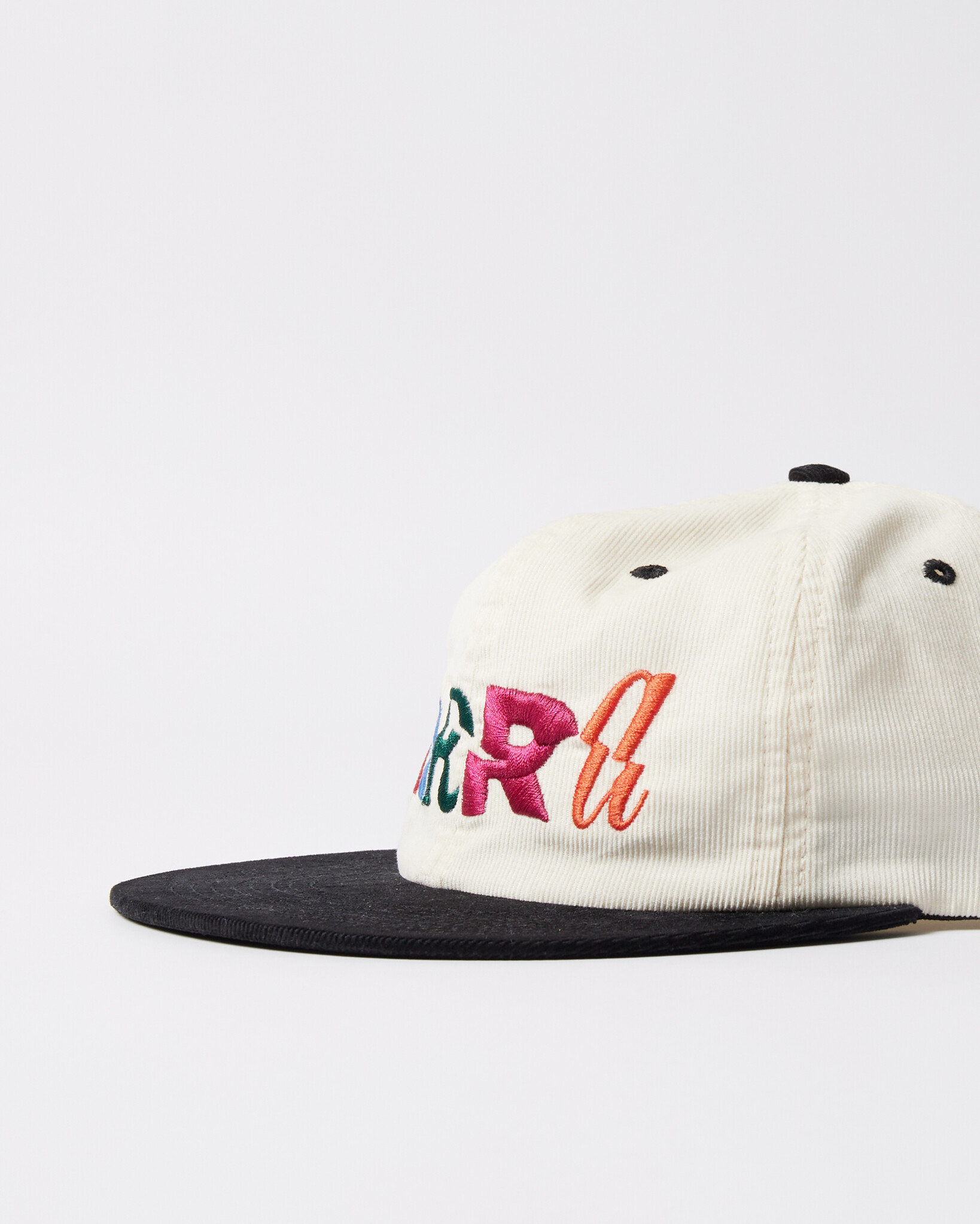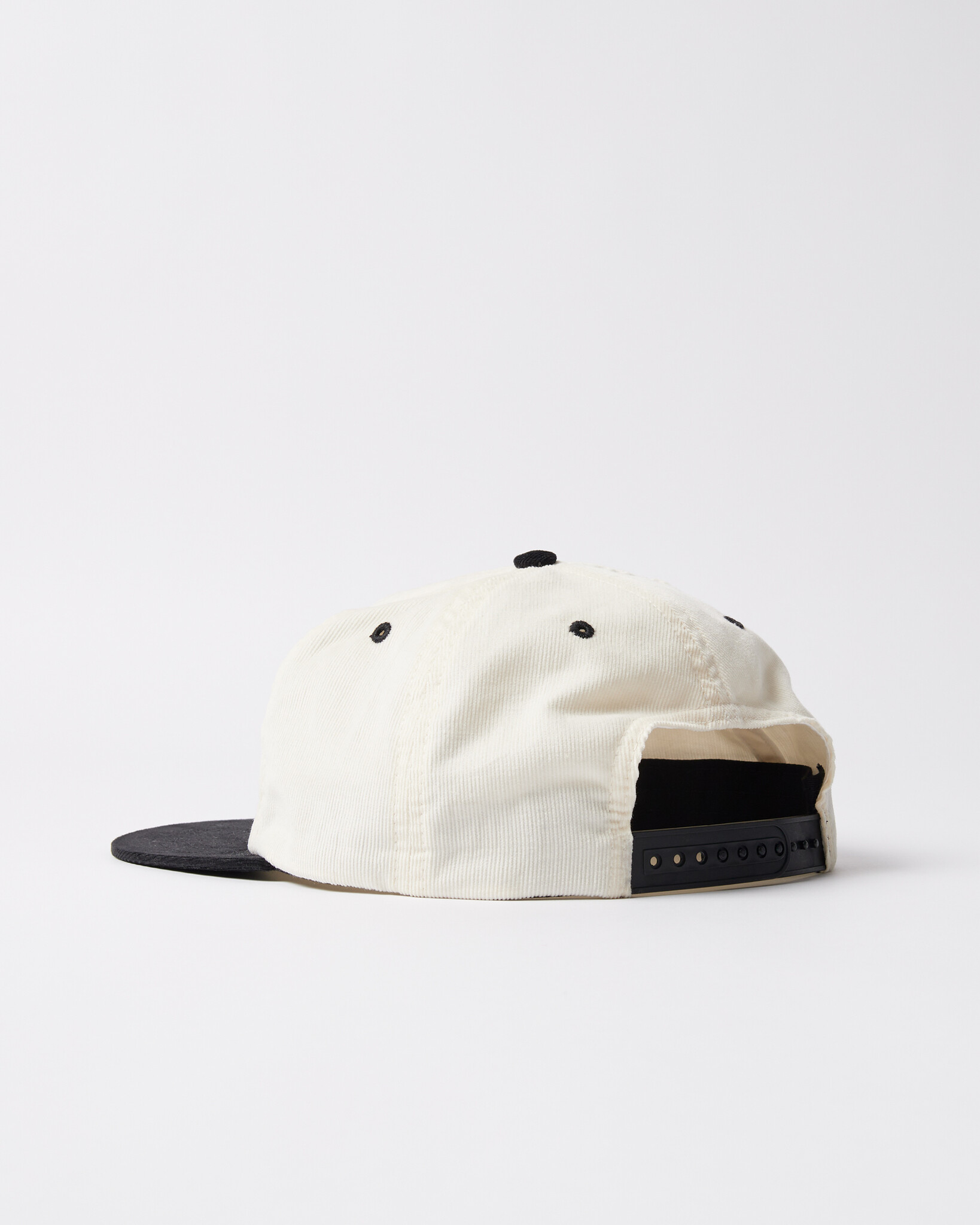 - Black top button, sewn eyelets, and visor