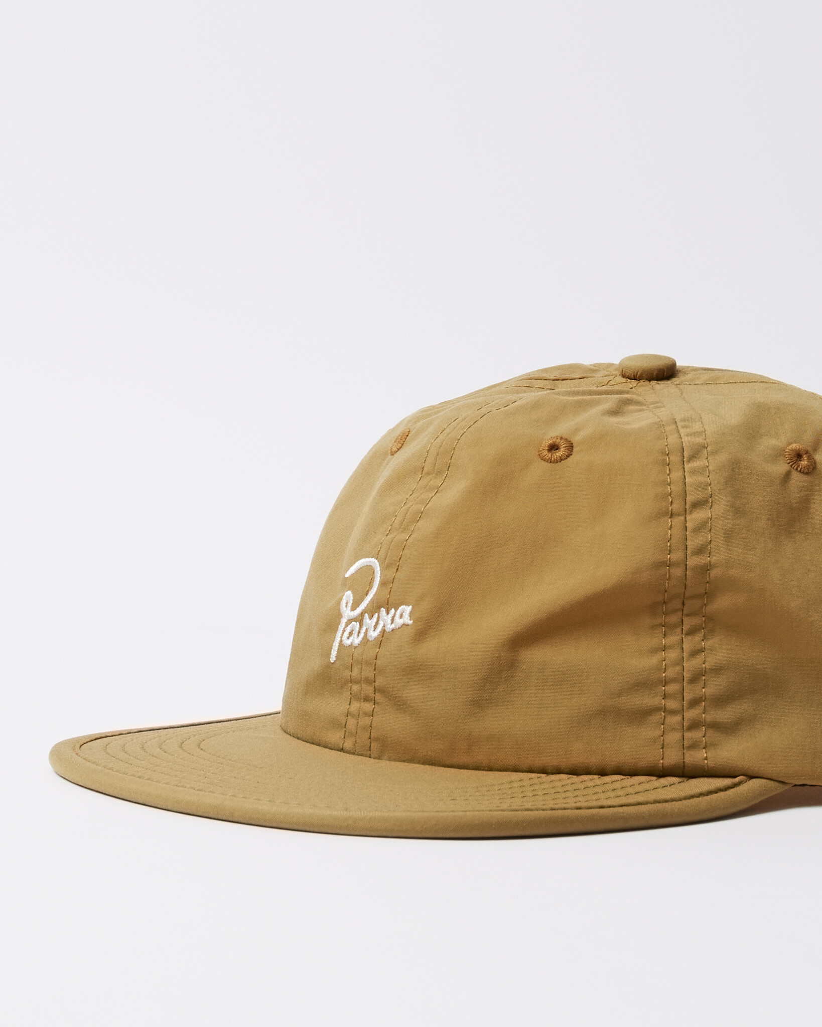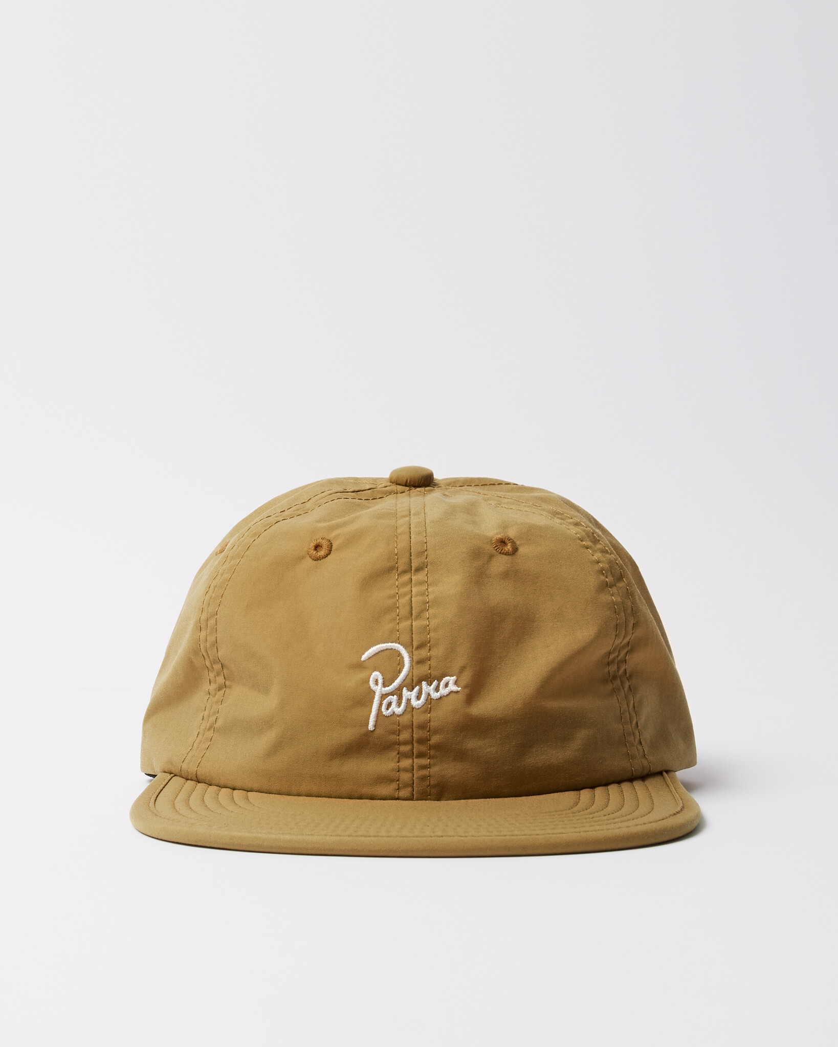 Unconstructed lightweight Cordura nylon fabric 6 panel hat with signature logo embroidery on the front.